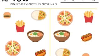 「同じものを見つけて○をつけましょう」——シンプルな指示の中に、実はたくさんの学びが詰まっているのが、マッチング(同じもの探し)プリントです。今回ご紹介するのは、ラーメンやハンバーガー、ピザなど身近な「たべもの」イラストを使ったマッチング...